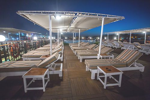 The separate bar area with comfortable Chesterfield sofas offers panoramic views of the Nile River and a restful place to relax with a book. The sun deck runs the length and width of the ship, a swimming pool and bar surrounded with elegant cane tables, chairs and sun loungers. The 24-hour reception desk provides full services as well as international telephone and safe deposit boxes. The gift shop on board provides both - practical items as well as gifts from Egypt.